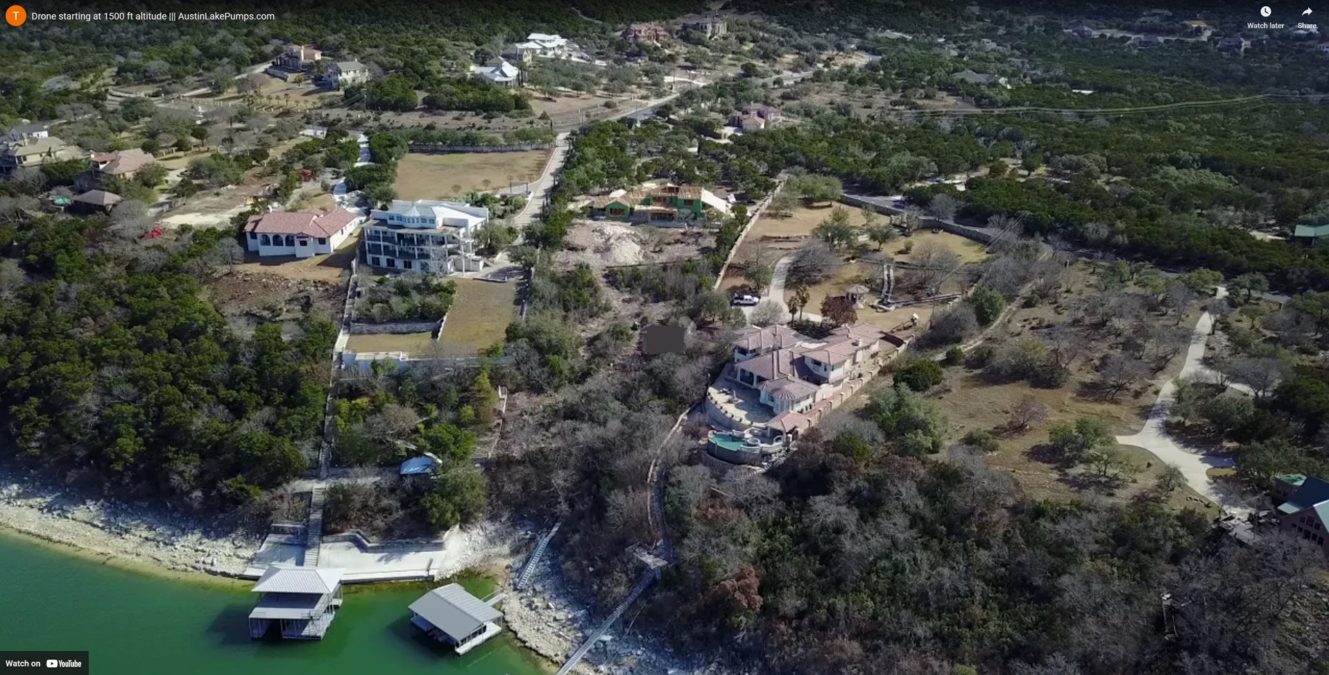 The 2nd largest installation of our career on Lake Travis at Volente, the property is in the middle with all the trees, the owner's floating boathouse is the one in the middle.